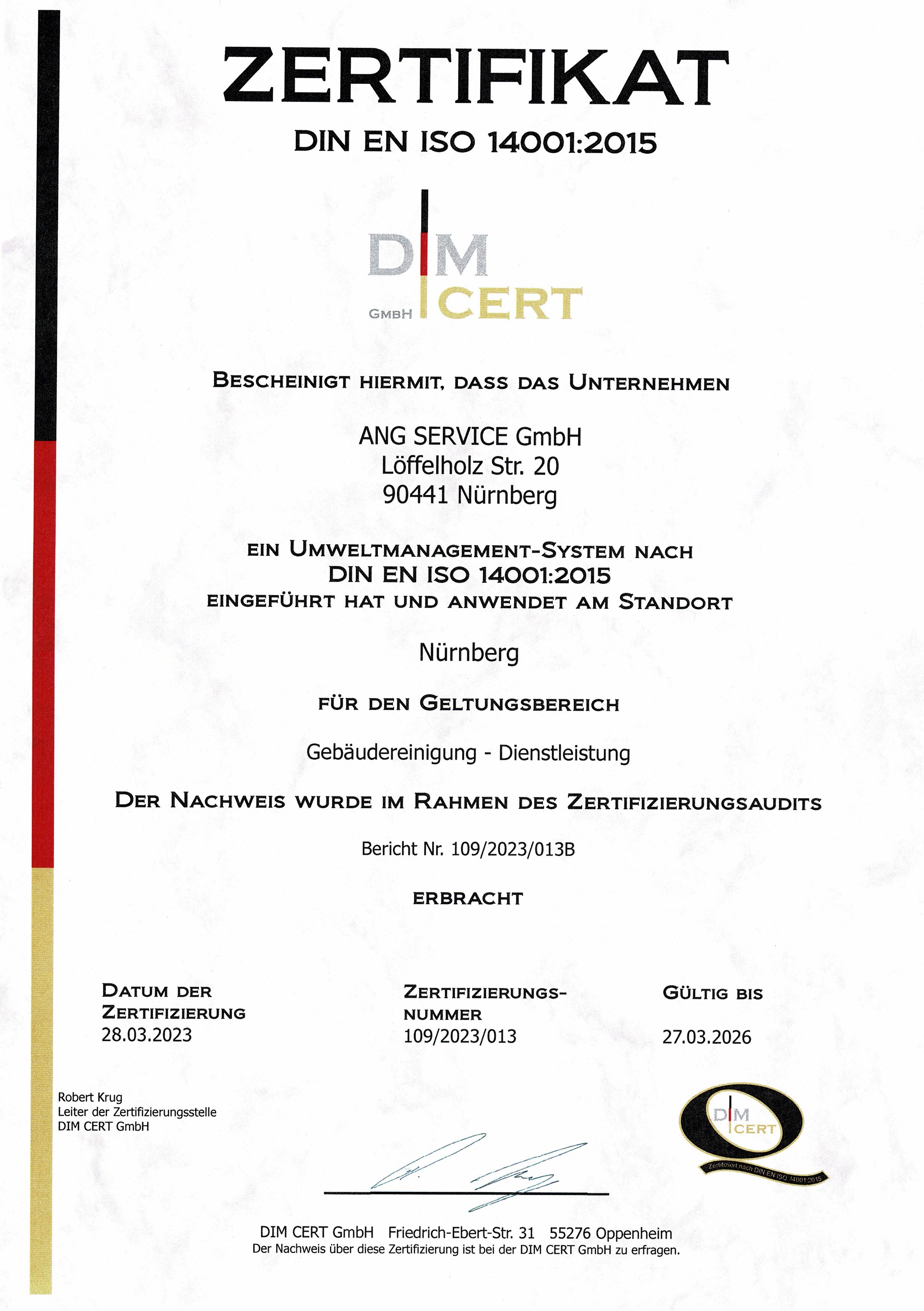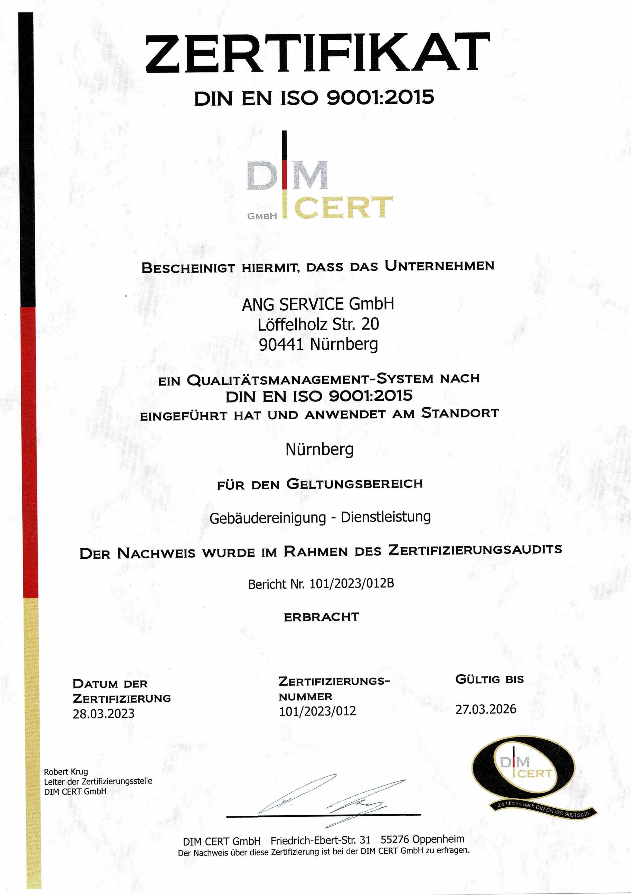 Mit unserem hochwertigen und nachhaltigen Service werden die Reinigungsarbeiten systematisch und effizient umgesetzt. Dabei setzen wir auf höchste Qualität und Hygienestandards. ANG Service GmbH ist nach Qualitätsstandard DIN EN ISO 9001:2015 und DIN EN ISO 14001:2015 zertifiziert. Um bestmögliche Reinigungsergebnisse zu erzielen, arbeiten wir mit fachlich qualifizierten und hoch motivierten Mitarbeitern. Mit einer zweistufigen Qualitätssicherung halten wir alle umwelt- und hygienerelevanten Reinigungsschritte ein.